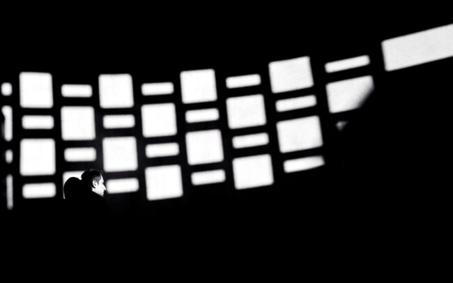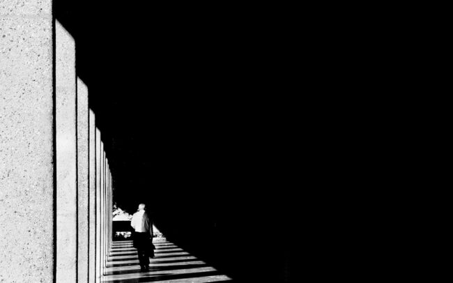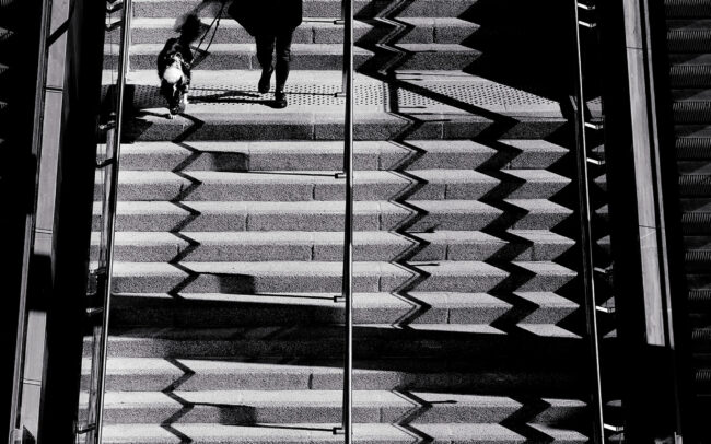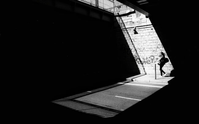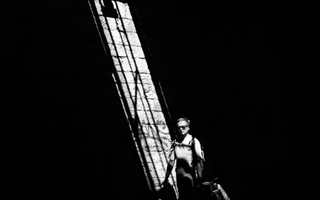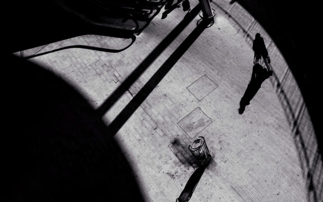 Dans La rue des-involtes, la ville apparaît comme un organisme en tension douce, une géométrie mouvante où les lignes se frôlent, se répondent et s’ouvrent parfois comme des passages inattendus. Il ne s’agit pas d’illustrer un récit, mais de mettre en lumière ce qui échappe au regard pressé : ces instants éphémères où le quotidien se suspend pour créer une scènographie authentique. L’espace urbain devient un terrain d’exploration silencieuse : chaque ombre semble dessinée, chaque forme sculptée. Le noir et blanc agit comme un langage qui ramène la ville à ses signes essentiels : surfaces, angles, géométries. Les façades, les parois et les silhouettes isolées composent un ensemble où se déploie une sensibilité attentive aux rythmes et aux matières.